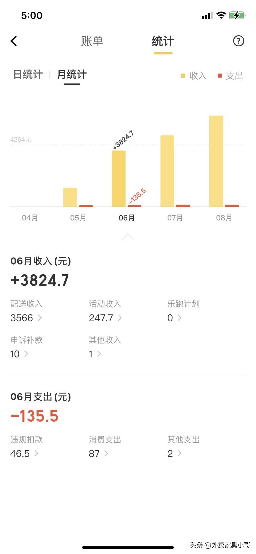 6月份:慢慢熟悉起来了,大致知道范围5公里商家地点了,不用愁着找不到商家而导致超时,对于一些路线还是不熟悉,需要手机导航,6月份平均4.5个小时,收入3689,有时候为了平台活动延长工作时间。完全超出兼职收入设想,一个月已经把电动车车钱赚回了,接下来就是盈利了。