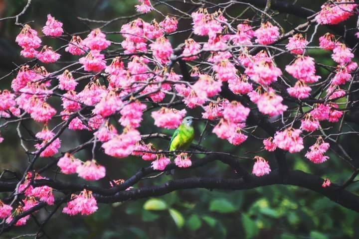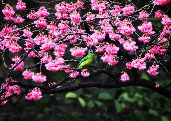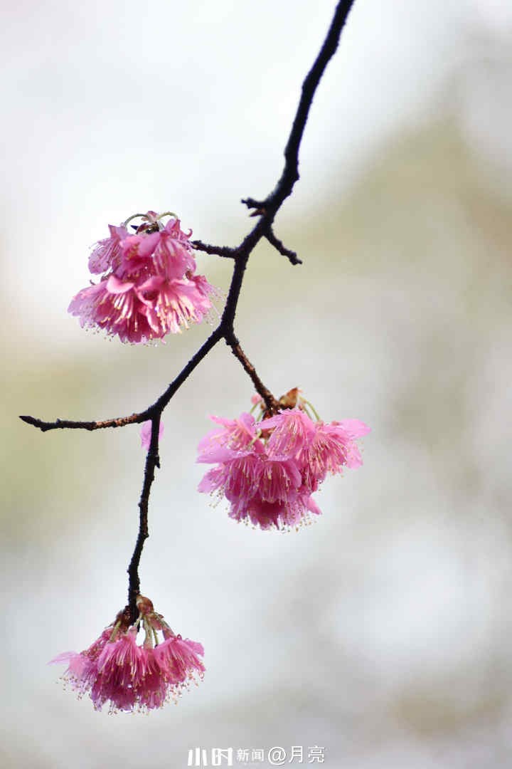 今年也不例外,几株山樱在春节期间已悄然开放,满树缀满绯红色的花朵,给杭州带来了春天的气息。