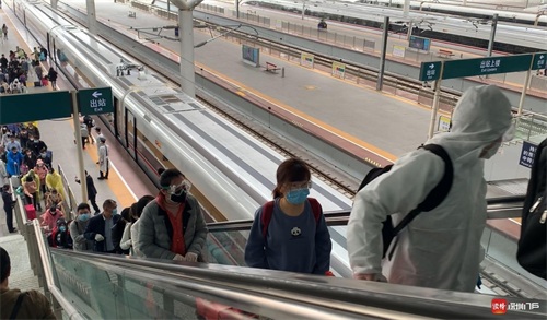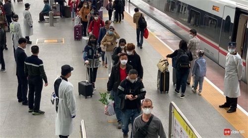 4月8日凌晨,离汉通道正式开启,铁路、民航逐步恢复运营。4月8日下午13:02,由武汉站开出的G1005次列车准点抵达目的地深圳北站,这是武汉铁路恢复运营后开到深圳的首班高铁。回到深圳的旅客难掩归家的兴奋。