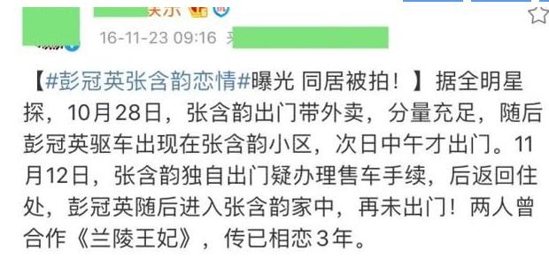也正是因为他们两人经常同框,因此,他们的一举一动,都很容易引起大家关注。其实早在2016年,就有网友爆料张含韵和彭冠英已经同居的消息,并且称两人早在拍制电视剧《兰陵王妃》之时,已经开始相恋。在2019年,网络再次传出张含韵与彭冠英两人已领证结婚,当时有知情人士透露称,“俩人感情确实很好,不过是否结婚要等到那一刻张含韵自己公布,目前不便透露。”