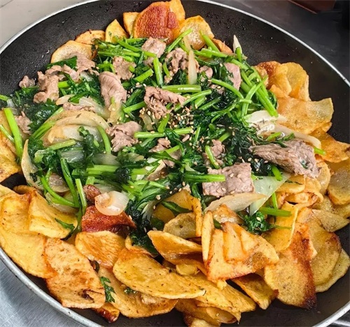 宽甸煎锅是丹东宽甸地标性特色美食。其做法是:先将土豆片大火煎炸至金黄,放入牛肉和圆葱,加入麻辣鲜,待牛肉完全熟后放入茼蒿,其口味独特非常好吃。