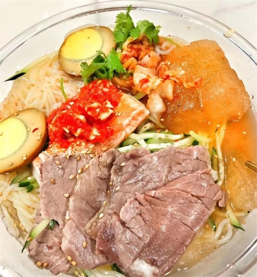朝鲜冷面是丹东朝鲜族的特色美食,面条是以荞面为主料,配上各种蔬菜水果,其特点是汤汁酸甜,爽口,面条劲道爽滑。