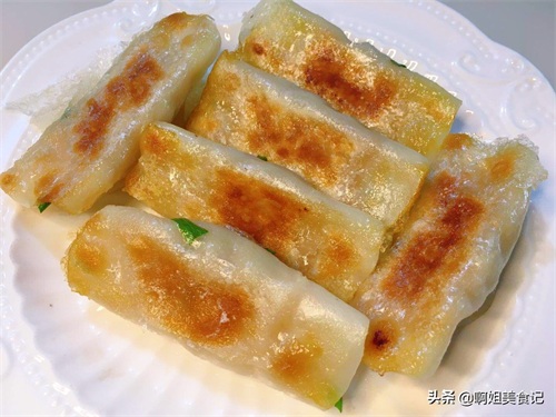 第五步:焖至水分变干后,撒些葱段,金灿灿的锅贴就可以出锅了,香气四溢。