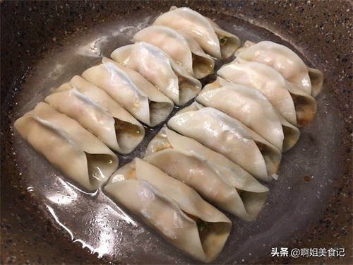 第四步:平底锅放少量油,码入锅贴,小火煎至锅贴底部变焦黄后倒入半碗的淀粉水,小火继续焖。