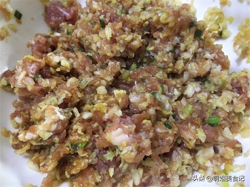 第二步:三分肥七分瘦的肉剁成肉末,加葱段,姜末,一勺盐,一勺料酒 ,一勺生抽,一勺胡椒粉和一勺蚝油,然后浇入热油激发出香味,搅拌均匀后加白菜末,再次搅匀,锅贴的馅料就调好了。