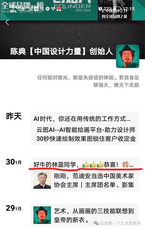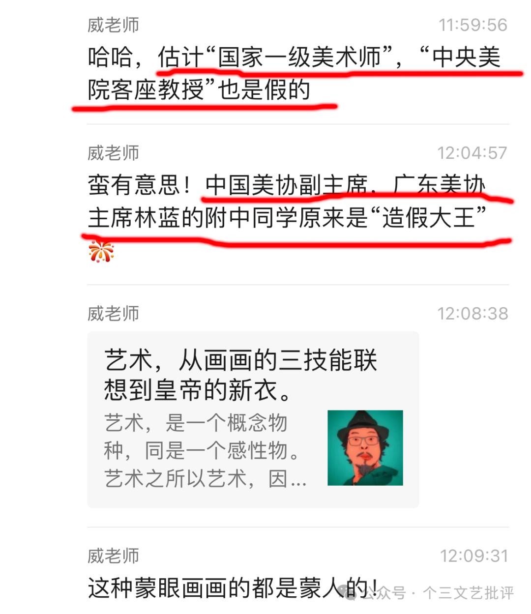 广东画家“威老师”发来《广东画坛"当代三杰"》推文及相关资料,质疑“三杰”之一陈典假冒“中美协会员,国家一级美术师、中央美院客座教授”。
