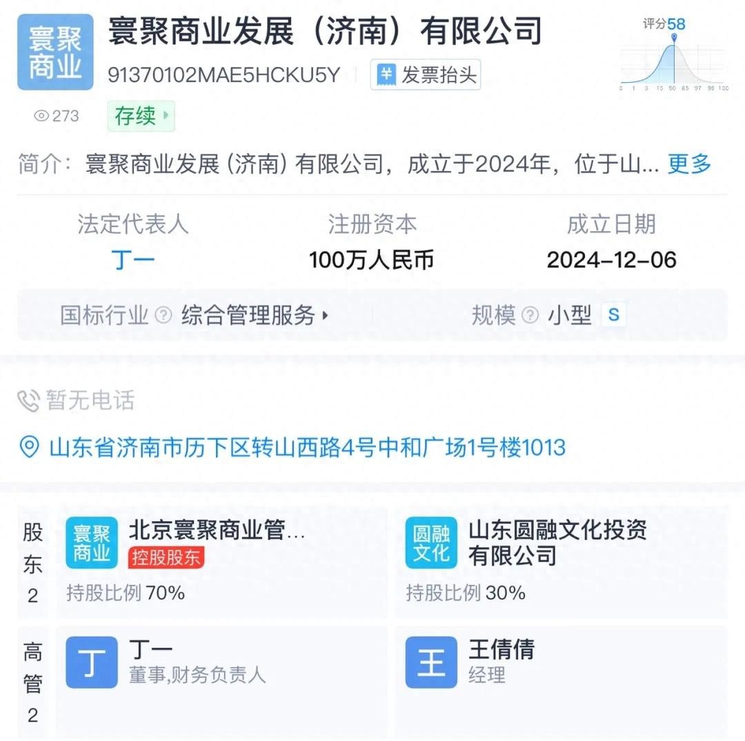 12月6日,寰聚商业发展(济南)有限公司(简称“济南寰聚”)在济南历下区注册成立,公司注册资本100万元。王思聪控股的北京寰聚商业管理有限公司(简称“寰聚商业”)持股70%,山东圆融文化投资有限公司持股30%,公司法定代表人为丁一。其业务包括供应链管理服务、企业管理、商业综合体管理服务、物业管理、停车场服务等。
