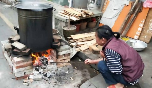 在草鞋街90号,十来平方的小屋和门前一块不大的空地就是李婆婆一家制作裹蒸的地方,旁边一个用砖垒砌的小灶上正煮着裹蒸。坐在家门口的李婆婆正忙碌地清洗柊叶,而屋内李婆婆的老伴谢伯和她的小孙子正在准备包裹蒸的材料。李婆婆说,快过年了,她每天大概都要包100多个裹蒸粽,有时候忙不过的时候需要孙子的帮忙。谢伯说:“我们做了20几年,裹蒸是肇庆春节必备的小吃。前几天有江门的游客路过,都买了不少回去。”