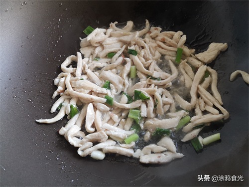 第二步:锅里倒油,油热后放入鸡胸肉翻炒至变色,然后加入少许料酒和十三香,翻炒均匀,加入葱花炒出香味。