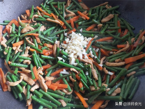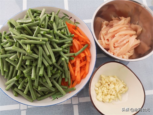 第一步:长豇豆摘掉头和尾,清洗干净后切成段备用;鸡胸肉切成和豇豆大约粗细的丝备用;胡萝卜切粗丝备用;大蒜切成蒜末备用。