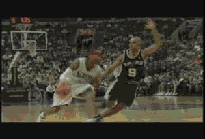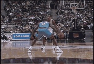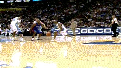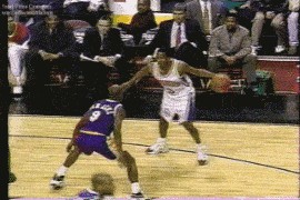 艾弗森第一次的胯下回拉就已经晃倒了对手,结果他停顿了一下等对手站起来再用一个变向突破。这时刚刚站起的防守球员再次被晃倒!