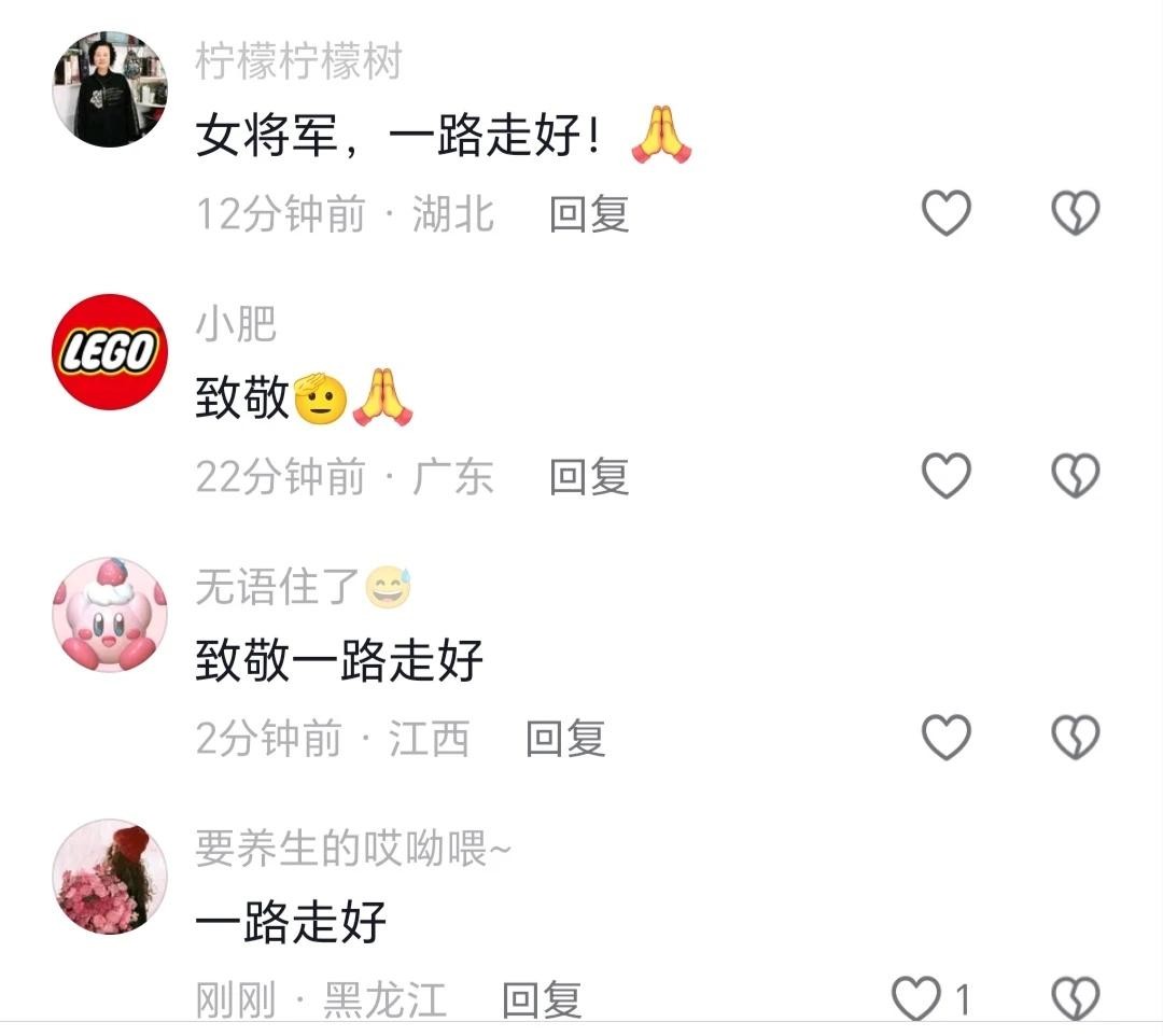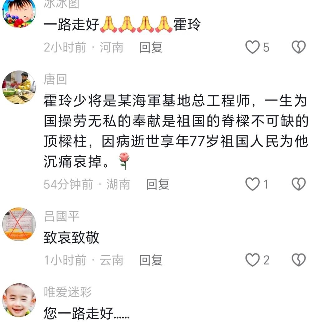 在霍玲将军的逝世消息传出后,网友们纷纷表示:沉痛哀悼,一路走好。是啊,女将军,您一路走好。虽然您已经离开了我们,但您的事迹和精神将永远激励着我们前行。