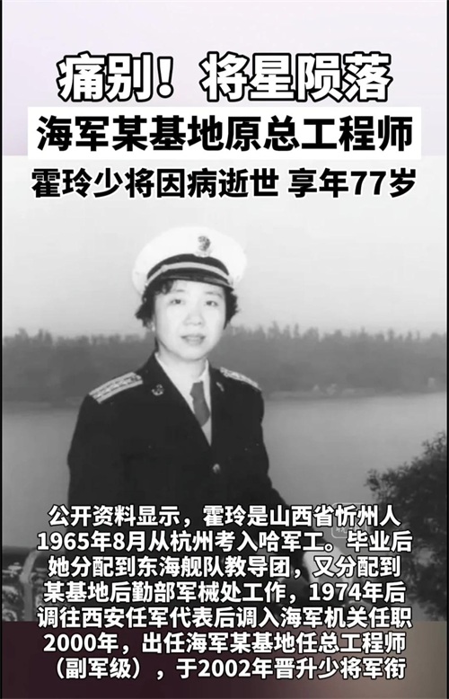 2024年4月1日,一颗璀璨的将星陨落,中国海军某基地原总工程师霍玲少将因病医治无效,与世长辞,享年77岁。消息传来,无数人心中涌起悲痛之情,为中国失去一位优秀的女将军而感到惋惜。