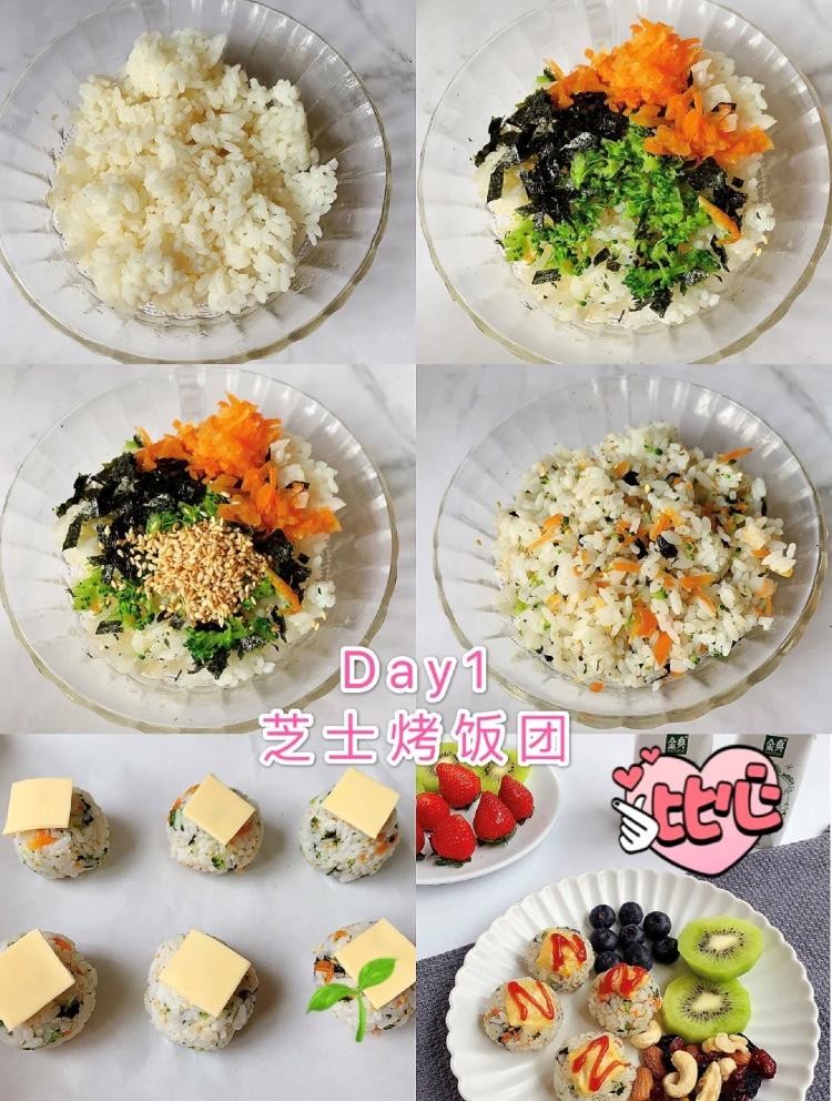 Day1:芝士烤饭团米饭加入胡萝卜,西兰花,海苔碎,熟芝麻和适量的盐拌匀。捏成圆球状,放上奶酪片,200度烤10分钟,挤上番茄酱。