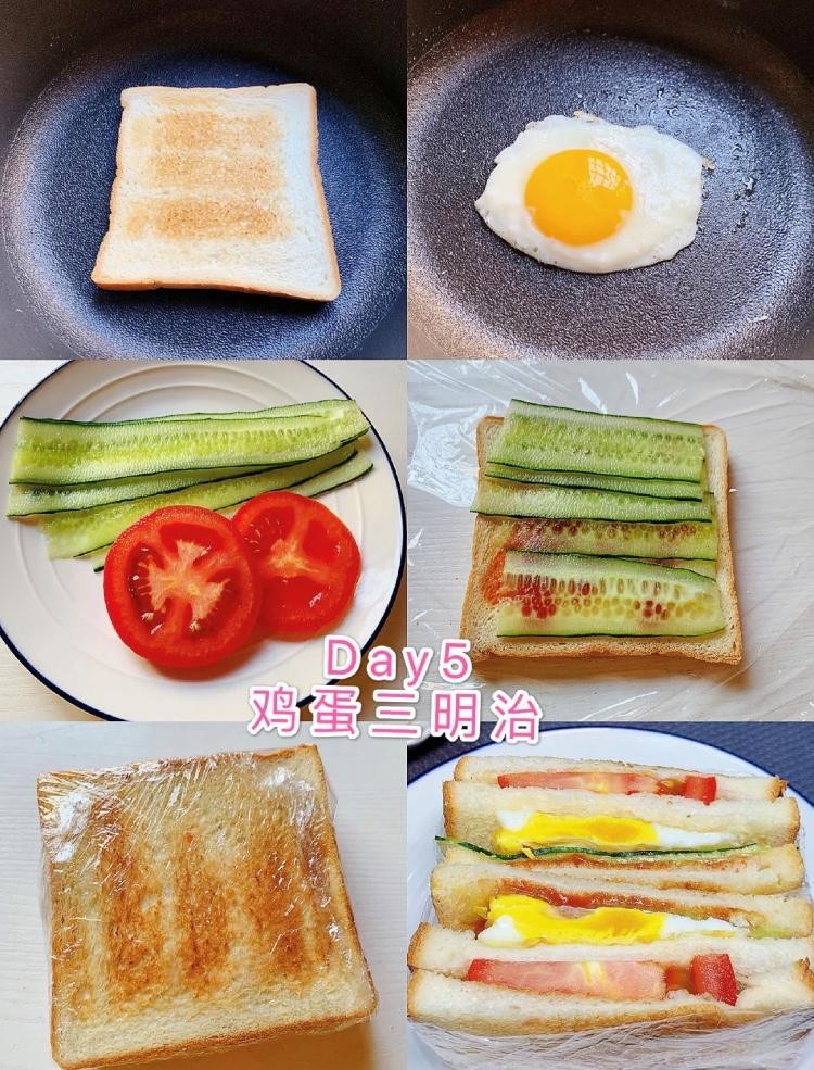Day5:鸡蛋三明治吐司放入锅煎至表皮酥脆。准备自己喜欢的食材,鸡蛋,番茄,黄瓜。铺上保鲜膜放一片吐司,抹上番茄酱或沙拉酱,放入鸡蛋➕黄瓜➕一片吐司➕番茄➕再盖一片吐司,包好对半切。