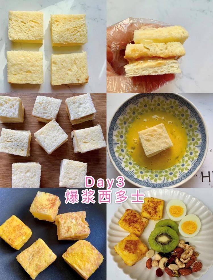 Day3:爆浆西多士土司一片切成四份,抹上芝麻酱➕炼乳,三片叠起。裹上鸡蛋液,小火煎至两面金黄。