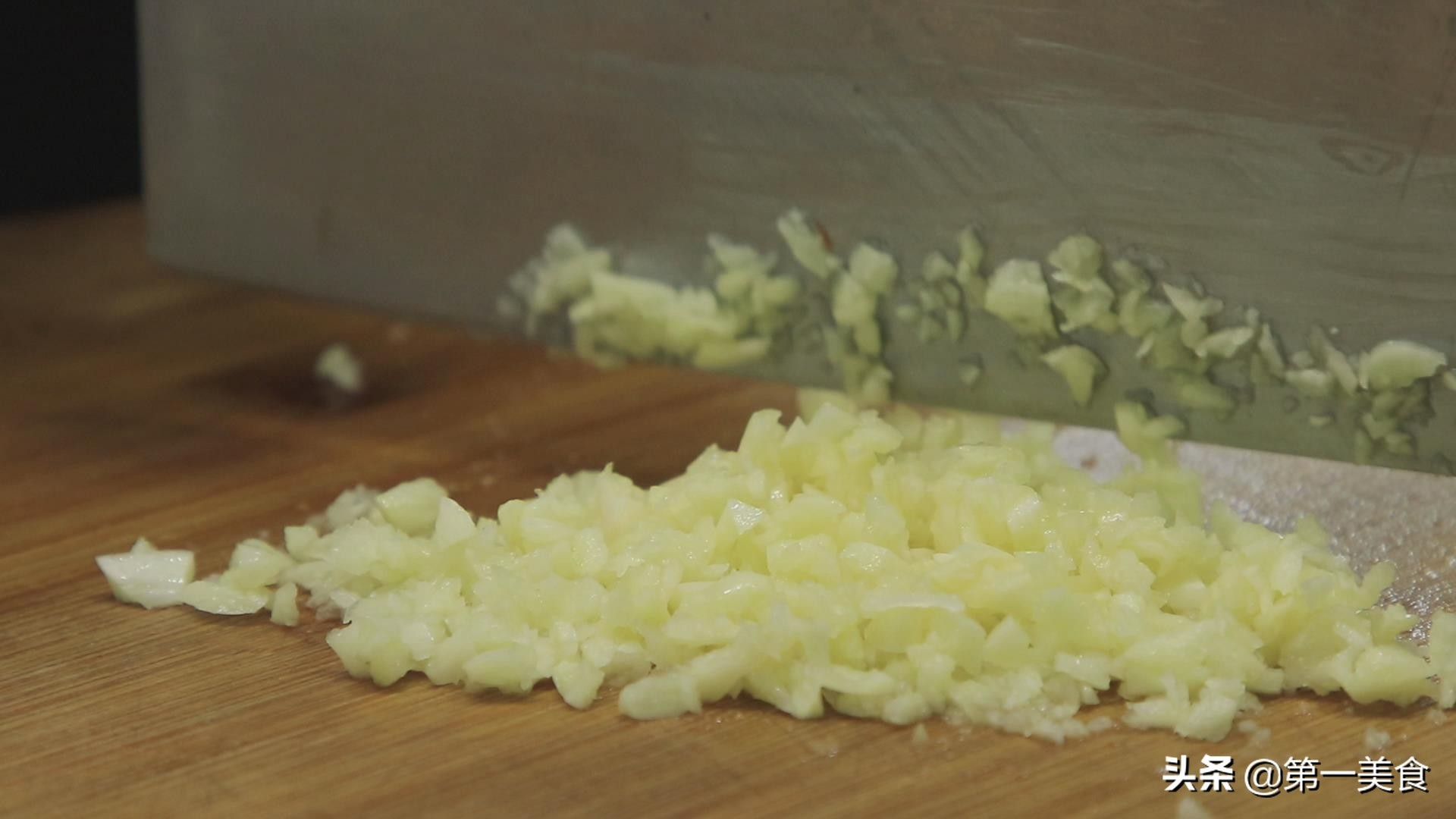 红椒半块斜刀切成细丝用来配色,大蒜几粒拍扁以后剁成蒜末。