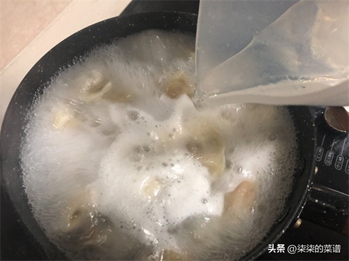 锅里倒入适量的清水,水烧开后下入饺子,用锅铲轻轻推动饺子,防止饺子粘在一块。肉馅的饺子比较不容易熟,点三次凉水后饺子差不多可以出锅了。