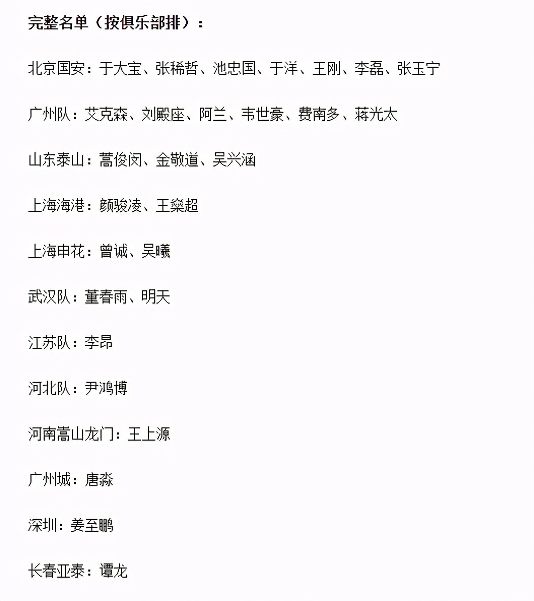 从名单可以看出,恒大和国安依旧是国脚大户,国安贡献了于大宝、张稀哲、池忠国、于洋、王刚、李磊、张玉宁共7名国脚,而恒大则输出了艾克森、刘殿座、阿兰、韦世豪、费南多、蒋光太6人。