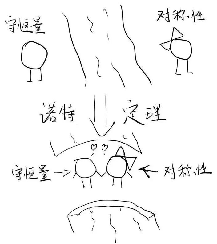 诺特定理说的就是,在一个物理系统中,如果发现该系统具有某种对称性,那么一定存在一种与之对应的物理量,这个物理量在该系统中是一个守恒量。也就是说物理系统的对称性与守恒量是一一对应的。