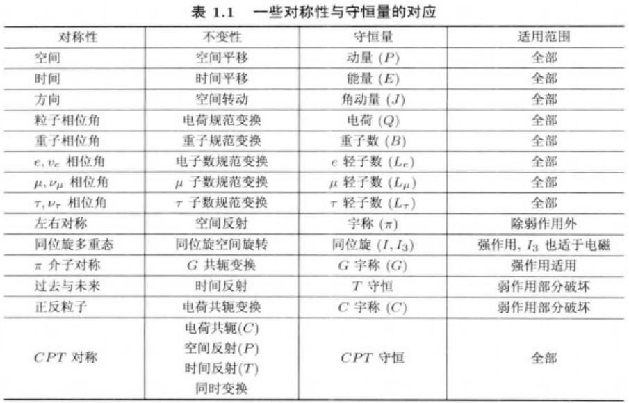 图五:对称量与守恒量之间的一一对应。图片来自文献 [3] 表 1.1