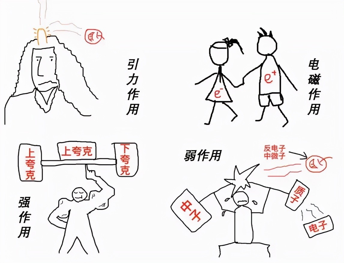 在微观世界中,基本粒子(例如质子,电子)之间经常发生碰撞,散射,衰变等粒子反应,在这些反应的前后粒子的种类会发生变化,导致这些粒子反应的而物理机制就是这些粒子之间的相互作用,在我们之前的科普作品中,我们已经介绍了粒子之间的相互作用分为引力,电磁,强,弱四种类型,这些相互作用本质上是不同的基本力,例如引力和电磁力: