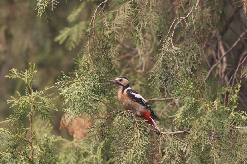 这个“踪迹”,往往是从一连串响亮的“哆哆哆哆”敲击木头的声音开始的,如果你怀着一些好奇心,走到声音传来的树下,抬起头往上看,没准儿就能看到一个黑白的身影正在树干上努力敲打呢。如果角度合适你还能看到它的白肚子和红红的屁股,有一句歇后语,说的是啄木鸟翻跟头——卖弄花屁股,看来这个红屁股给人的印象也是非常深刻的。