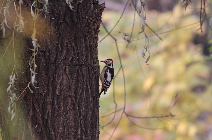 不过,只要我们留心观察就会发现,大斑啄木鸟在北京城里还是很不少的,像圆明园、天坛这样树木茂密,环境优美的公园自不必说了,就算稍大一些的小区,只要有一些年纪大一些的树,特别是杨树榆树之类,也能发现大斑啄木鸟的踪迹。