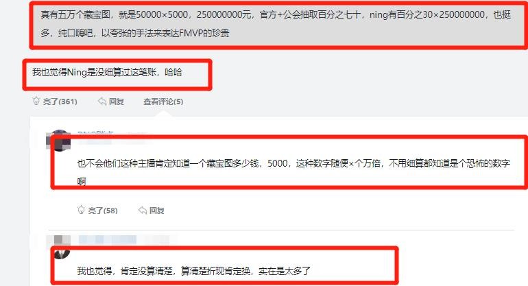 看来FMVP的奖杯,对于宁王真是意义非凡啊,但是宁王说这句话之前,可能没有细算。为什么这么说呢?因为50000个藏宝图的价格可真的不菲。宁王所在的平台,一个藏宝图的价格是5000块,也就是50000x5000=250000000,共计2.5亿元。就算有平台抽成、公会抽成,落到宁王手里之后,最起码也有30%的钱。
