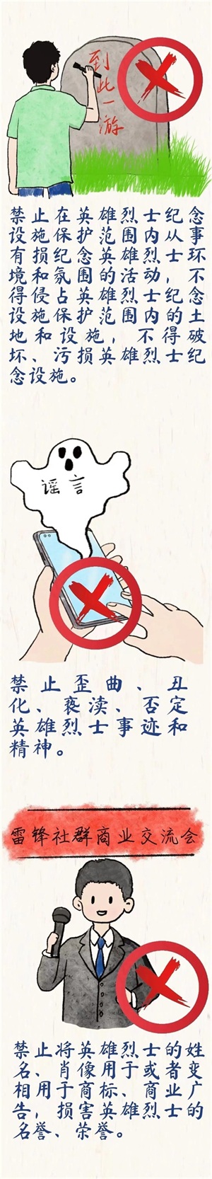 任何组织和个人不得在英雄烈士纪念设施保护范围内从事有损纪念英雄烈士环境和氛围的活动,不得侵占英雄烈士纪念设施保护范围内的土地和设施,不得破坏、污损英雄烈士纪念设施。