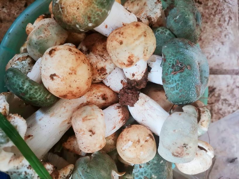 说起青头菌,这是大众认知最为统一,也是最为广泛的蘑菇了差不多统一称呼“青头介”,而别的蘑菇名字就太多了,青头菌学名变绿红菇,这种蘑菇也不是云南独有的,据我所知,在重庆和贵州也可以捡到这种蘑菇,而至于为何学名被称为变绿红菇,可能和青头菌的品种有关,青头菌共四类:有白青头,整朵都是白色的;有霉青头,绿色的外面有一层白色的霉覆盖;有红青头,蘑菇的盖子中央是绿色色,四周是红色,贵州就有这样的红青头;最后一类就是整朵绿色的青头菌了,也是最常见的,分布最广的。四种蘑菇都可以吃,无毒。