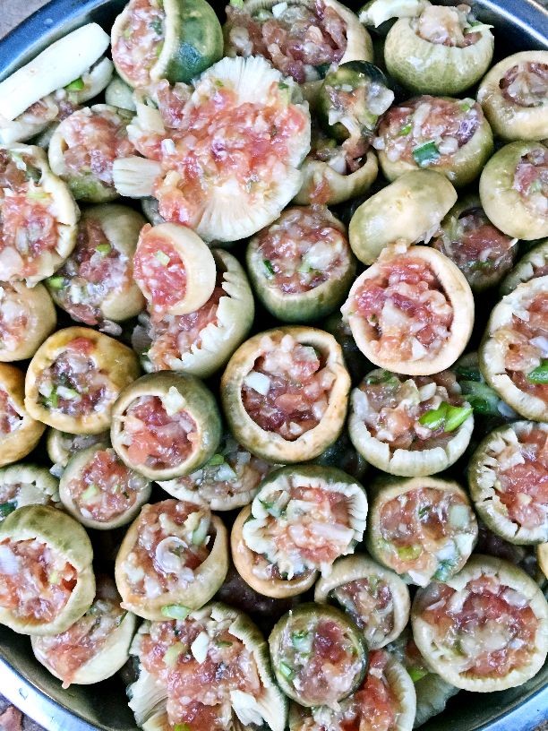 青头菌有两种吃法最为广泛,一是直接用来煮,煮熟后撒上葱花,烫鲜美无比,菌烫用来下面条更是别有一番风味,二是把青头菌帽子和杆分开,将加了葱姜盐酱油调味的碎肉沫填充在帽子里,蒸熟,一口下去,清香伴着肉的满足感,别提多爽了。