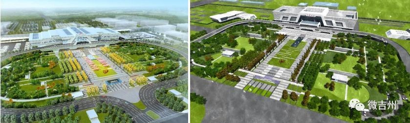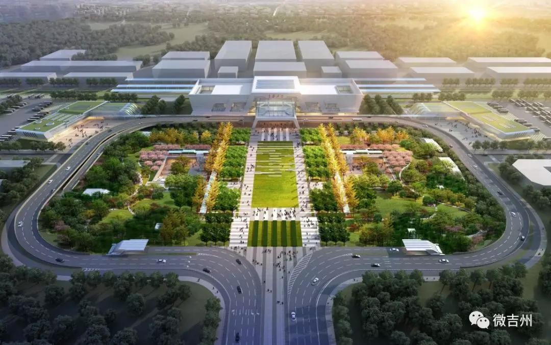 站前广场由中轴景观区、交通通行区、站前停留区、生态绿化区、下沉广场区组成,引入了海绵城市设计理念,是集交通、休闲、生态、形象展示多位一体的城市核心开放空间,仿佛是吉安城市“新客厅”。