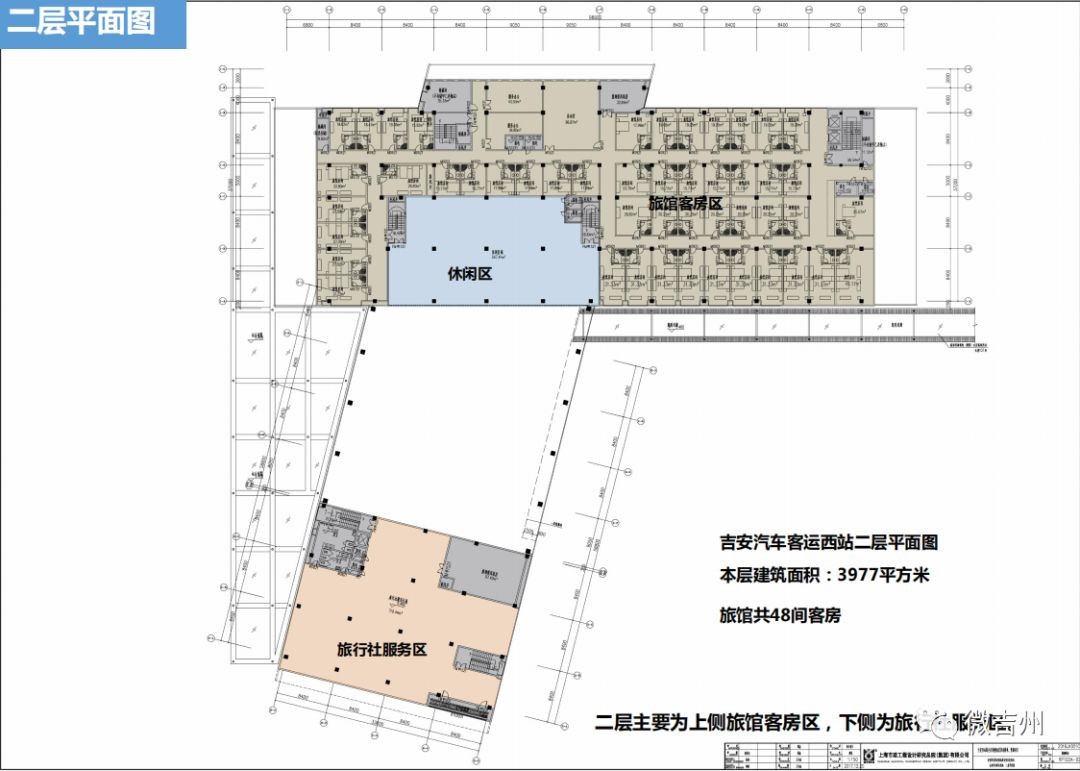 吉安汽车客运西站一层由售票大厅、候车大厅、出站区、长途客运办公区、旅游集散办公区和旅馆大厅组成。二层主要为上侧旅馆客房区,下侧为旅行社服务区。
