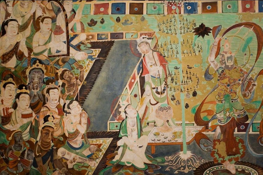 石窟壁画富丽多彩,各种各样的佛经故事,山川景物,亭台楼阁等建筑画、山水画、花卉图案、飞天佛像以及当时劳动人民进行生产的各种场面等,是十六国至清代1500多年的民俗风貌和历史变迁的艺术再现,雄伟瑰丽。
