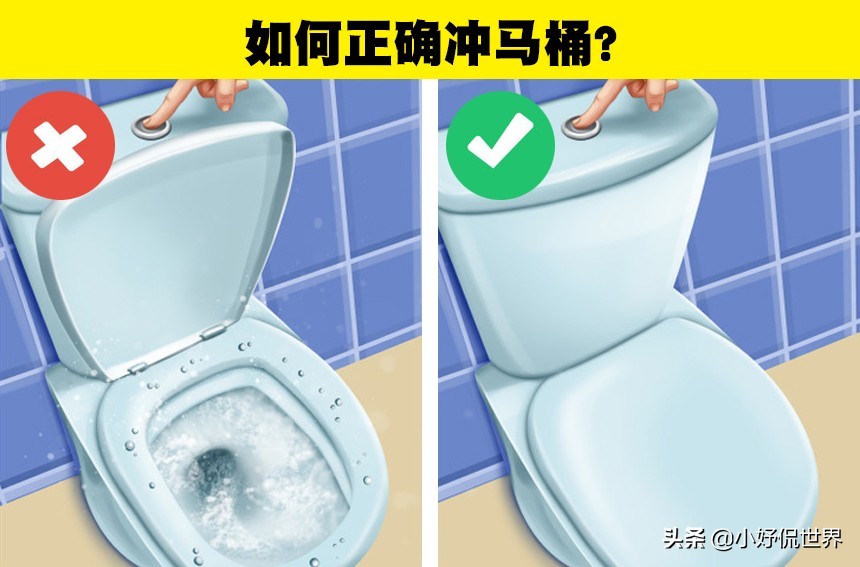上完厕所要冲马桶,这本来似乎是没有什么值得去思考的事情。然而,我们必须注意的是马桶盖的作用。当你上完厕所,尤其是排便了以后,最好能够盖上马桶盖了再按下冲水按钮。这是因为每当你进行冲水操作的时候,马桶中的微生物就会开始朝着上方释放,范围可以超过25厘米。某些微生物甚至可能会传染疾病。所以,你最好能够盖上马桶。并且结束以后一定要洗手。