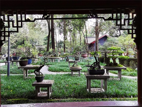 人民公园的盆景园位于公园中部偏南少城苑中,占地2600平方米,内设有休息长廊、荷花水池,池岸用假山堆砌,配置麦冬及杜鹃,池中载植睡莲、荷花、马蹄莲、伞草、菖蒲等水生植物。园内林木葱郁,翠竹摇空,绿荫满地,环境幽静。常年展出盆景200余盆,其中山水盆景20余盆,树桩盆景180余盆,主要有榆树、银杏、罗汉松、紫葳、金弹子、铁梗海棠等古树、桩头。