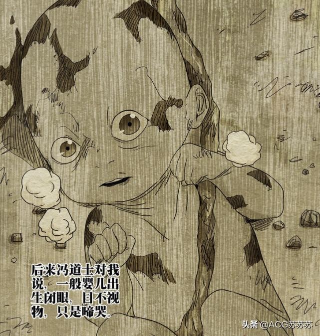 不仅仅如此,无根生还不是正常婴儿,而是有着“大凶之兆”的棺材仔。就漫画中可以看到,无根生出生在遍地死尸的地方,而其身上还有着脐带,身后则是背靠大树的母亲。毫无疑问,无根生的母亲已经去世,而腹中的无根生正是靠着仅剩的养分活着,这个时间并不长,极有可能只是两三天的时间。至于无根生如何从母亲腹中出来,那就有可能是擅食腐肉的乌鸦所致了。