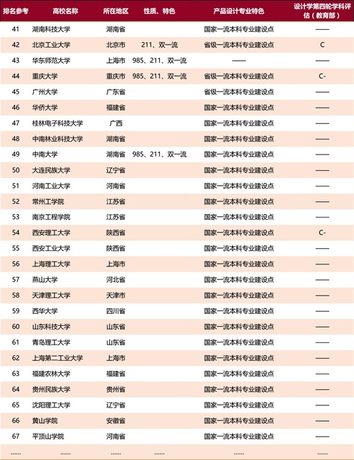 这是我国高校中产品设计专业实力较强的60多所大学,其中清华、江南、同济、国美是我国设计学学科在第四轮学科评估中获评A+的4所顶尖设计强校,产品设计专业都是比较强的。清华、同济既是985大学,又是顶尖设计名校,产品设计专业报考竞争最大。国美是2大顶尖独立美院之一,产设专业报考竞争同样激烈。