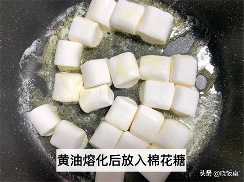 3、黄油加热至熔化后把提前准备好的棉花糖放入锅内。