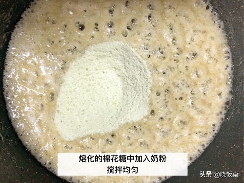2、棉花糖下入锅内后一定要及时转小火翻炒,翻炒均匀后就立刻加入奶粉,如果火太大或翻炒时间过长会变得又硬又粘牙,影响牛轧饼干的口感。