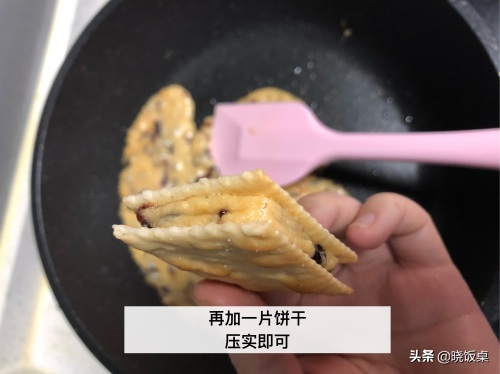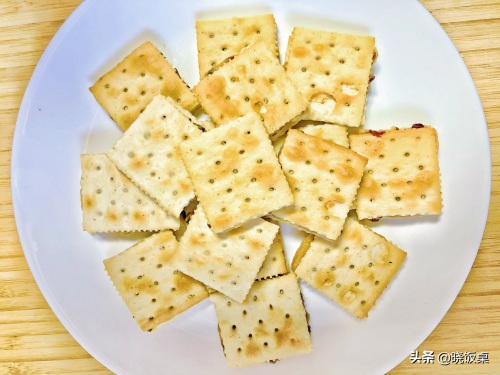 10、依次类推,直到把所有苏打饼干加完,至此,这份好吃的牛轧饼干就做好啦。