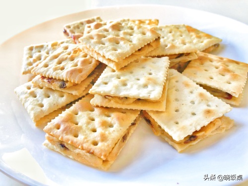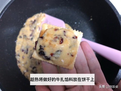8、取出苏打饼干,趁热把馅料均匀的涂抹在饼干上。