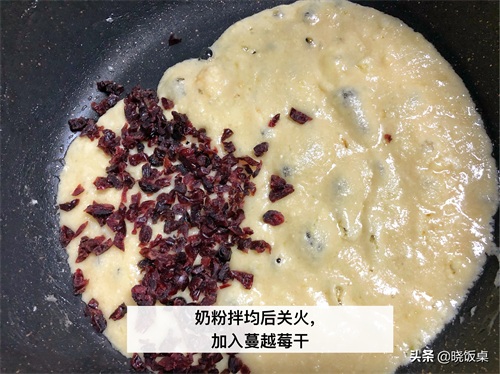 6、奶粉搅拌均匀后直接关火,关火后加入之前切碎的蔓越莓干。