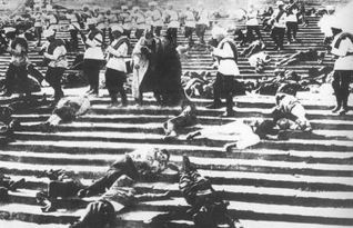 使画面更具有吸引力,抓住了观众的眼球。此段之所以拍摄母子而不是父子的原因在于,妇女和儿童在战争中一直是处于弱势群体,此处更能体现导演想要传达的感情。整个部分导演运用整齐武装的军队从阶梯走下的镜头与人们惊慌逃跑镜头的不断切换,表现了沙俄政府对哗变和革命的残酷镇压,加强了画面的紧张感和屠杀的严酷,刺激观众的视觉加剧矛盾冲突,加深印象。
