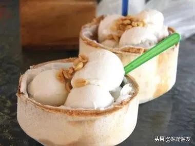 椰子冰淇淋:椰子冰淇淋的制作工艺通常是将椰子汁制成冰淇淋,味道清甜。有些还会在上层覆盖炼乳、巧克力、炒花生等,挖着椰子里的椰子肉一起吃。椰子冰淇淋的味道特点是椰奶香味十分浓郁,雪糕里还夹有椰肉丁,Q弹有嚼劲,整体口感软糯,入口即化,吃起来凉凉的,自然甜美,在酷热的越南非常受欢迎。