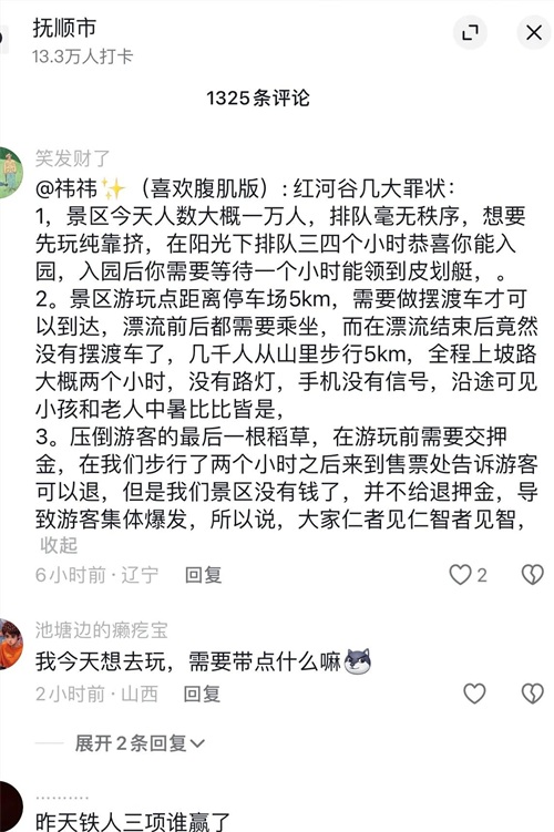 这波操作下来,红河谷算是名誉扫地了。游客受罪不说,整个抚顺城市形象也跟着遭殃。说到底,还是旅游管理太混乱,安全意识太薄弱。希望此事能警醒有关部门,尽快拿出整改措施,还游客一个安全有保障的旅游环境!对此,你怎么看?欢迎在评论区留言讨论!