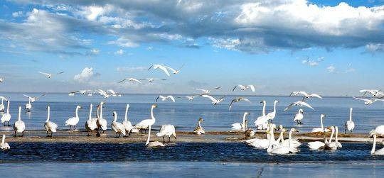 青海湖位于青藏高原上,距西宁150公里。青海湖是我国最大的内陆湖泊,也是我国最大的咸水湖,面积4400多平方公里,海拔3260多米。青海湖四周被四座巍巍高山所环抱,烟波浩渺、碧波连天的青海湖,就像是一盏巨大的翡翠玉盘平嵌在高山、草原之间,构成了一幅山、湖、草原相映成趣的壮美风光和绮丽景色。这里地势高,气候十分凉爽。即使是烈日炎炎的盛夏,日平均气温也只有15℃左中,是理想的避暑消夏胜地。
