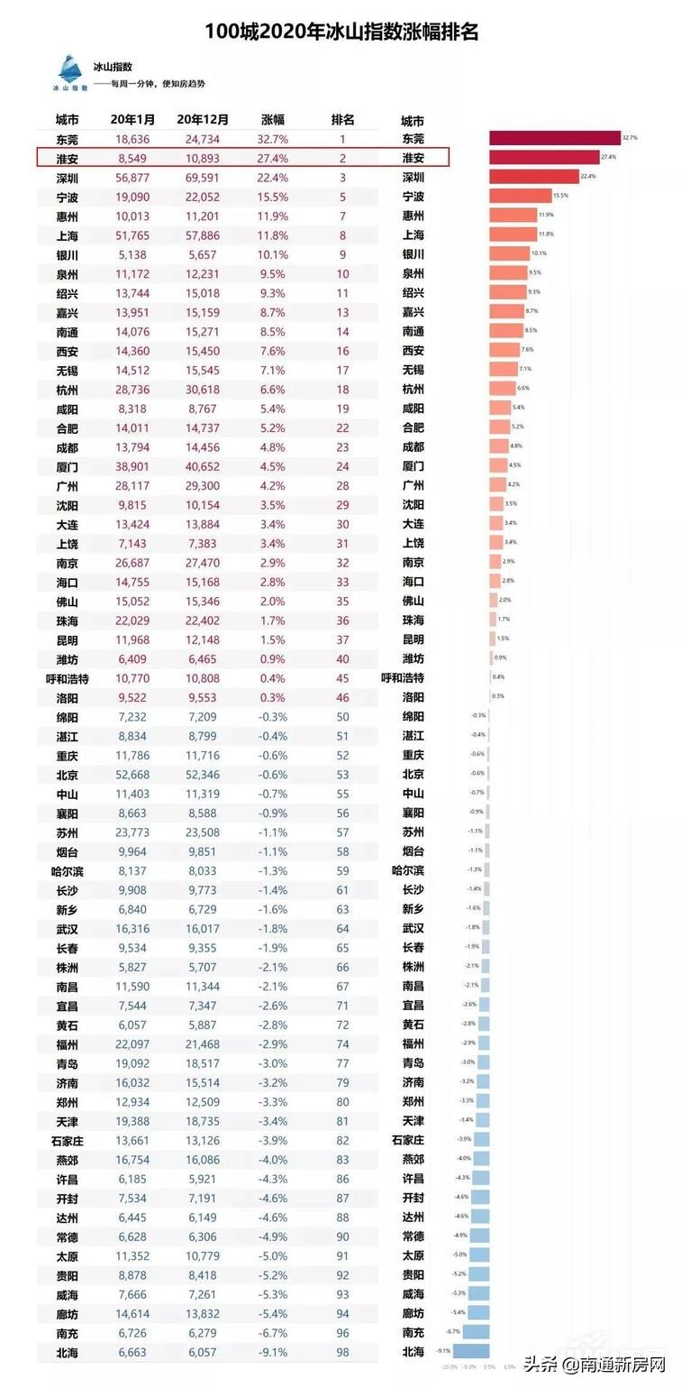 从100城2020年冰山指数涨幅排名中,淮安涨幅居第二。