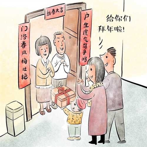 拜年:春节期间走访拜年是年节传统习俗之一,是人们辞旧迎新、相互表达美好祝愿的一种方式。